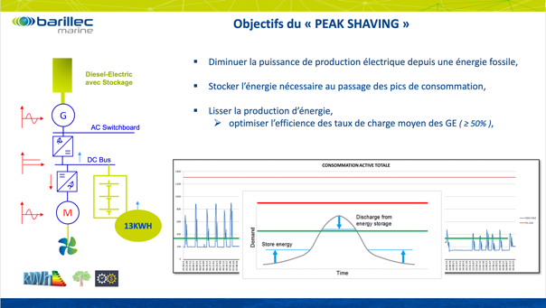 Le Peak shaving ou écrêtage de pointes, proposé par Barillec Marine, technologie utilisée par les fournisseurs et distributeurs d’énergie de réseaux terrestres, permet de gérer les pics de charge et de restituer la puissance nécessaire en temps voulu. Afin d’éviter un surdimensionnement des moteurs diesels, Barillec Marine préconise l’installation d’un système de stockage qui optimise la production d’énergie nécessaire pour des laps de temps très courts. C’est une réponse adaptée pour gérer des pics de charge très variables, sans émissions polluantes (CO2, NOX, SOX…). En réduisant la puissance installée on réduit aussi la facture de carburant et les coûts d’exploitation et d’entretien (intervalle).